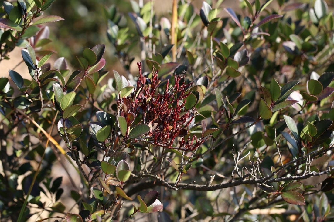 겨우살이 종류들은 숙주식물들과는 별개의 종이 활물기생하여.. 줄기나 잎이 숙주식물과 전혀 다른 모습인데.. 위 사진을 보면 이상현상을 보이는 줄기에 적으나마 사스레피나무의 잎모습이 보이네요.