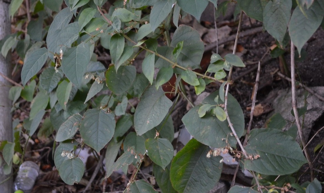 덩굴풀로 열매를 달고 있는 삽 모양의 큰 잎은 호장근입니다~.