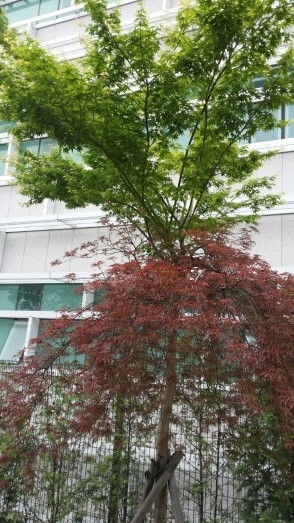 공작단풍이라고 하는 광단풍을 접목할때 흔히 대목으로 사용하는 산단풍의 1m~1.5m 높이에서 접목을 많이 하는데 그 접수곁에서 원대목의 순이 자라서 그렇게 이중적인 나무가 많이 보이기도 합니다. 원대목의 순을 재거해야 하는데 제거하질 않으셨군요.